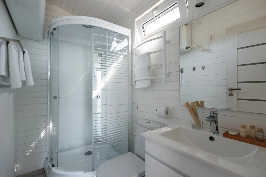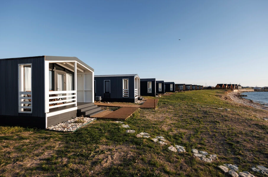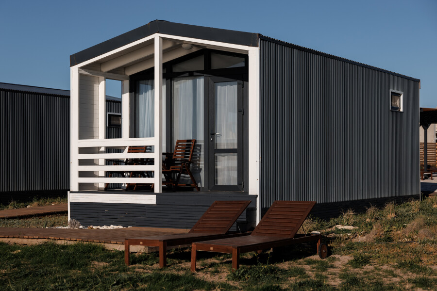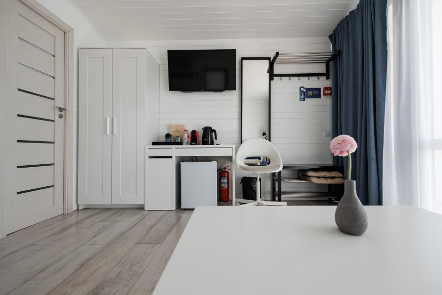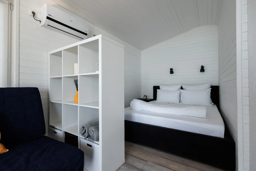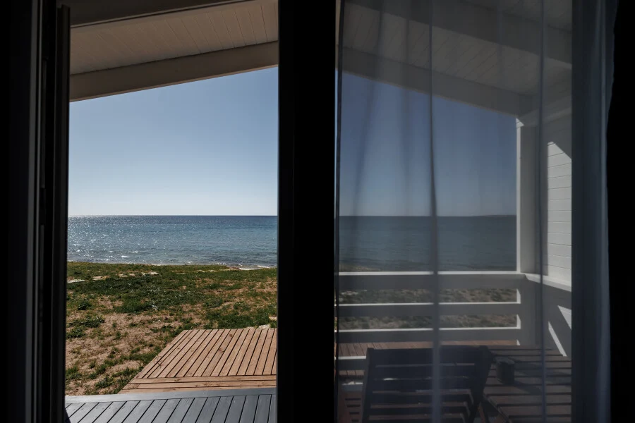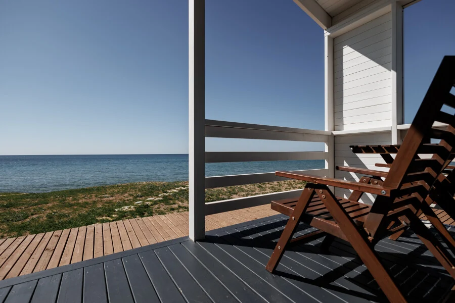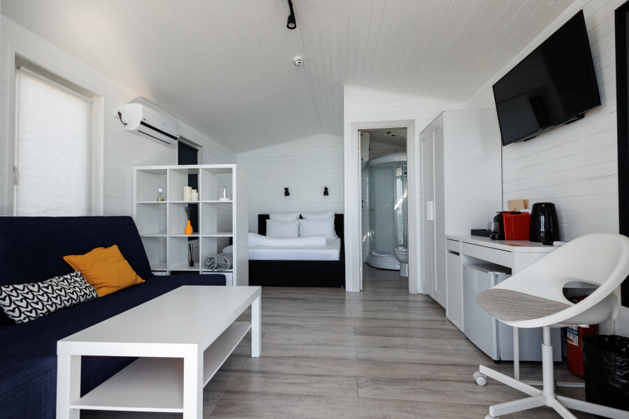 Каркасный юнит с террасой в скандинавском стиле, с панорамным видом прямо на море. Расположен в пятнадцати шагах от моря. Юнит оснащен стильной и удобной мебелью, ванной комнатой, сплит-системой, бытовой техникой, гардеробной системой, wi-fi сетью. Юнит имеет собственную террасу с деревянной мебелью, и возможность разместить удобные деревянные шезлонги возле террасы. Наполнение юнита: • Двуспальная кровать с ортопедическим матрасом • Двуспальный диван • Оснащенный санузел с системой фильтрации воды • Стеллаж • Письменный стол